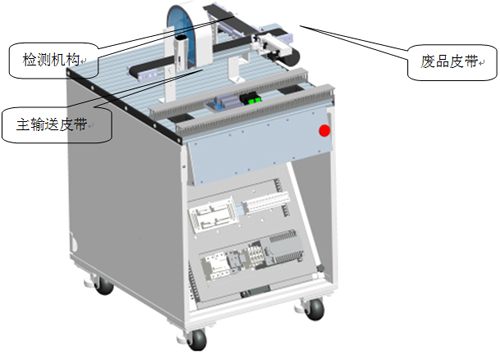 主皮帶運(yùn)行,接收上一站擰好蓋后的物料瓶子,當(dāng)物料瓶經(jīng)過(guò)檢測(cè)機(jī)構(gòu)時(shí):回歸反射傳感器檢測(cè)瓶蓋是否擰緊;檢測(cè)機(jī)構(gòu)檢測(cè)瓶子內(nèi)部顆粒是否符合要求;對(duì)擰蓋與顆粒均合格的瓶子進(jìn)行瓶蓋顏色判別區(qū)分;擰蓋或顆粒不合格的瓶子被分揀機(jī)構(gòu)推送到廢品皮帶上(短皮帶);擰蓋與顆粒均合格的瓶子被輸送到皮帶末端,等待機(jī)器人搬運(yùn)。