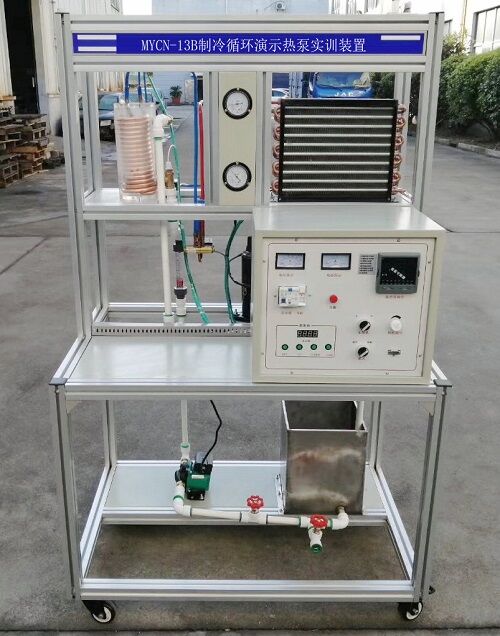 制冷循環(huán)演示熱泵實(shí)訓(xùn)裝置,制冷循環(huán)演示熱泵實(shí)訓(xùn)設(shè)備,制冷循環(huán)演示熱泵實(shí)訓(xùn)臺(tái)適用于制冷、空氣調(diào)節(jié)、食品冷凍、家電等專業(yè)的教學(xué)。系統(tǒng)由壓縮機(jī)、蒸發(fā)器、冷凝器組成,蒸發(fā)器采用透明耐壓玻璃作殼體,可直接觀察到制冷劑的蒸發(fā)和冷凝現(xiàn)象,并通過進(jìn)出水溫的變化可觀測(cè)制冷效果。系統(tǒng)由一套風(fēng)冷機(jī)組、一套冷水系統(tǒng)組成,通過實(shí)驗(yàn),可撐握風(fēng)冷冷水系統(tǒng)的工作方式、組成特性和系統(tǒng)工況。